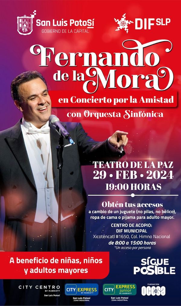 La Presidenta del Sistema Municipal DIF, Estela Arriaga Márquez, y el Alcalde Capitalino, Enrique Galindo Ceballos, invitan a las y los potosinos a celebrar San Valentín con el Concierto con Causa por la Amistad que ofrecerá el tenor Fernando de la Mora: «Será a beneficio de nuestras niñas, niños y personas adultas mayores, mediante el cual fortaleceremos también la inclusión, pues habrá acceso a personas con discapacidad», explicó la titular del DIF capitalino, Estela Arriaga Márquez.