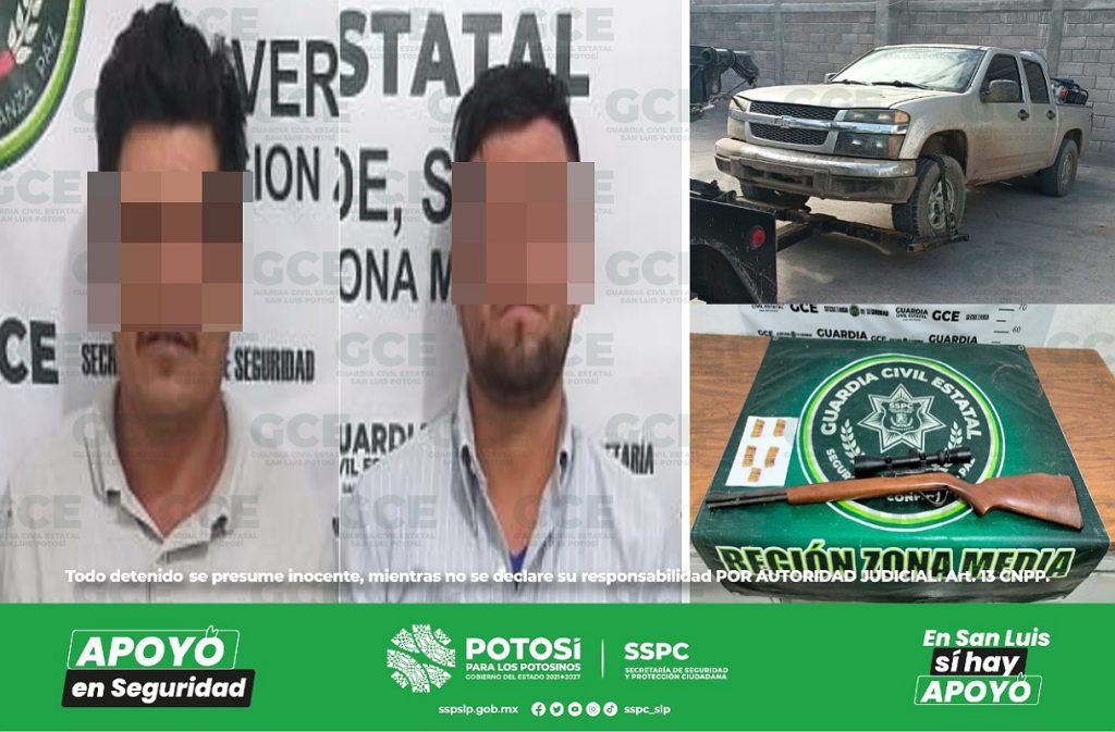 El primer hecho fue en la localidad El Capulín, elementos estatales adscritos al municipio de Rioverde, capturaron a César “N” de 46 años de edad y a Enrique “N” de 27 años, sorprendidos a bordo de una camioneta marca Chevrolet, línea Colorado, sin placas, en donde se les aseguró un rifle calibre .22 con mira telescópica y 46 cartuchos útiles.