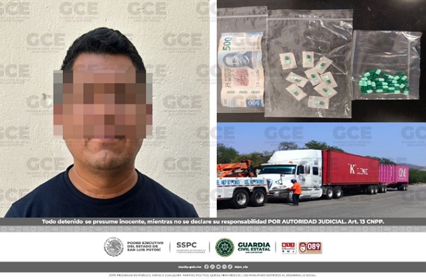 Cerritos, S.L.P.- El despliegue operativo por carreteras estatales que desarrolla la División Caminos de la Guardia Civil Estatal (GCE), permitió la detención del conductor de un transporte de carga, por los probables delitos de posesión de droga y cohecho.