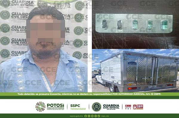 San Luis Potosí, S.L.P.- Para garantizar la paz pública y evitar actos que pongan en peligro a la población potosina, oficiales de la División Caminos de la Guardia Civil Estatal, recorrían la zona Industrial, lugar en donde detuvieron a un conductor, por la probable posesión de psicotrópicos.
