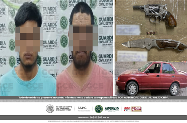 De inmediato se inició una persecución que culminó en el Libramiento Norte, logrando la captura de Mario “N” de 45 años de edad y de Diego “N” de 19 años; asegurándoles un arma de fuego tipo revólver, calibre .22 así como siete cartuchos útiles y una navaja, además del automotor en el que se desplazaban.