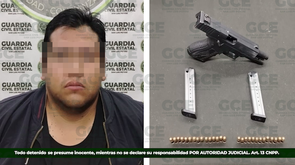 Derivado de estas acciones, detuvieron a un presunto, por el probable delito de portación de un arma de fuego, durante sus labores en la carretera Libramiento Oriente – San Luis Potosí, luego de que fuera detectado un masculino, deambulando cerca de los vehículos de carga, estacionados en el sector.