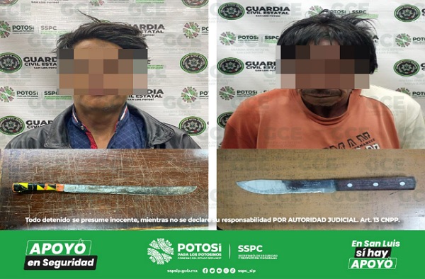 S.L.P.- Patrullajes preventivos efectuados tanto en la capital potosina como en el municipio de Soledad de Graciano Sánchez, permitieron que elementos de la Guardia Civil Estatal (GCE) detuvieran a dos hombres con armas punzocortantes.