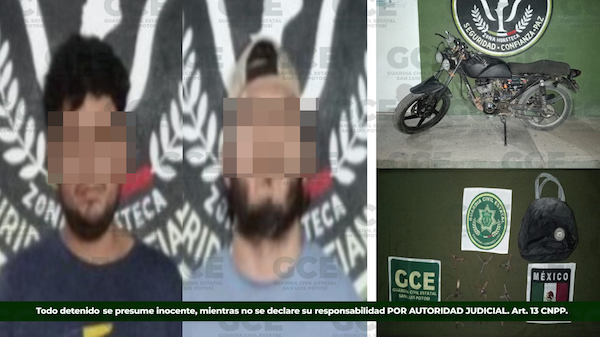 Ciudad Valles, S.L.P.- Operativos de seguridad desplegados en la colonia Del Carmen, derivaron en la detención de dos hombres, por probables delitos contra la seguridad, luego de que efectivos de la Guardia Civil Estatal (GCE) los detuvieran a bordo de una motocicleta con placa sobrepuesta y con artefactos prohibidos.