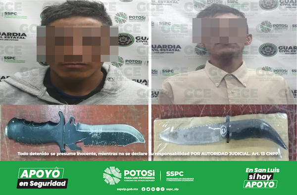 San Luis Potosí, S.L.P.- Gracias a los patrullajes de prevención y disuasión, efectuados en la zona metropolitana, se detuvo a dos individuos, luego de que agentes de la Guardia Civil Estatal (GCE) les aseguraran armas punzocortantes que presumiblemente llevaban consigo.