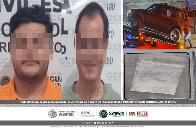 Rioverde, S.L.P.- Derivado de los dispositivos preventivos, efectuados por agentes de Guardia Civil Estatal (GCE) dos masculinos fueron detenidos por el probable delito de manejo temerario además de posesión de droga.