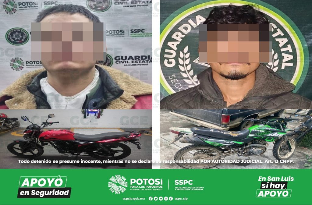 S.L.P.- Como resultado de los dispositivos efectuados en la capital potosina y en el municipio de Axtla de Terrazas, elementos de la Guardia Civil Estatal (GCE) detuvieron a dos motociclistas quienes probablemente viajaban a bordo de unidades con reporte de robo.