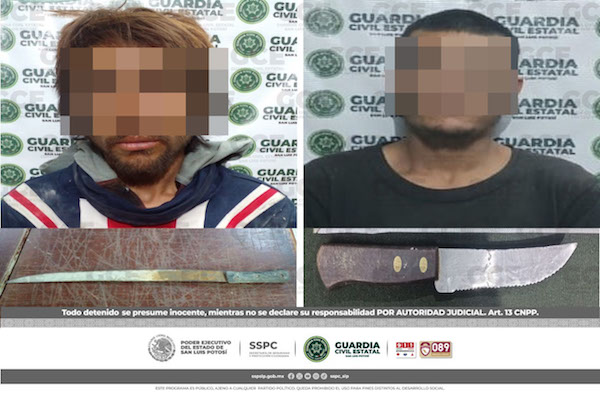 Uno de los hechos se suscitó en la colonia Alamitos, lugar en donde fue detenido Jesús “N” de 30 años de edad, luego de asegurarle un machete con el que presumiblemente deambulaba en la zona; mientras que en el municipio de Soledad de Graciano Sánchez, en la colonia San José Primera Sección, fue detenido Jonathan “N” de 22 años, con un cuchillo.