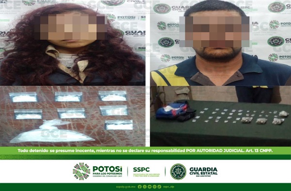 San Luis Potosí, S.L.P.- En acciones contundentes contra el narcomenudeo, oficiales de Guardia Civil Estatal (GCE) detuvieron a un hombre y una mujer, presuntos narcomenudistas de grupos criminales, luego de asegurarles dosis de “cristal” y marihuana.
