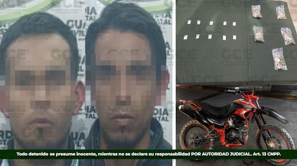 A los presuntos se les aseguró cinco bolsas de marihuana,10 dosis de la droga conocida como “cristal” y una motocicleta marca Italika, color rojo con negro.
