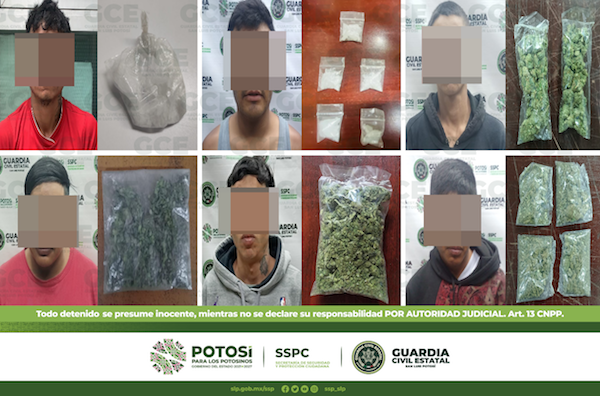 Una de las detenciones se suscitó en la capital potosina, en el Barrio de San Sebastián, donde los elementos de la GCE detuvieron a José de 20 años de edad con una dosis de marihuana; en Barrio de Santiago, José de 19 años resultó detenido con una dosis de marihuana; en la colonia El Aguaje, Noé de 45 años fue detenido con cinco dosis de “cristal”; también, José de 23 años fue detenido tras asegurarle una dosis de marihuana; en la misma zona, Francisco de 33 años fue detenido con tres dosis de marihuana, además se le aseguró una motocicleta en la que se desplazaba.