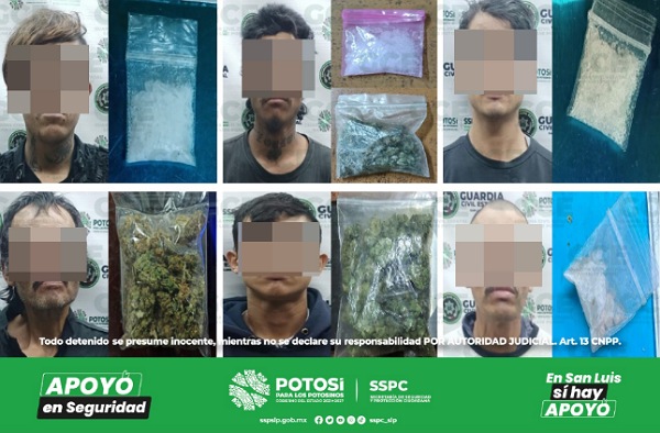 S.L.P.- Con el refuerzo de la vigilancia y patrullajes disuasivos, implementados en los 58 municipios de San Luis Potosí, agentes de la Guardia Civil Estatal (GCE) efectuaron la detención de 22 personas en las últimas horas, tras probables delitos contra la salud; al asegurarles dosis de estupefacientes entre sus pertenencias.
