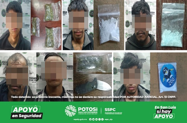 En la colonia Morales Campestre, Miguel “N” de 18 años de edad, fue detenido con una dosis de “cristal”; en las células operativas de reacción inmediata, Oscar “N” de 29 años de edad, fue detenido en la colonia El Mezquital, con una bolsa que contenía marihuana; otro de los hechos, en la colonia Industrial San Luis, Brayan “N” de 24 años fue asegurado con una dosis de marihuana; mientras que en la colonia Progreso, Martín “N” de 32 años, quedó detenido con una dosis de “cristal”; sobre la colonia El Saucito, José “N” de 26 años, fue asegurado con una dosis de “cristal”.