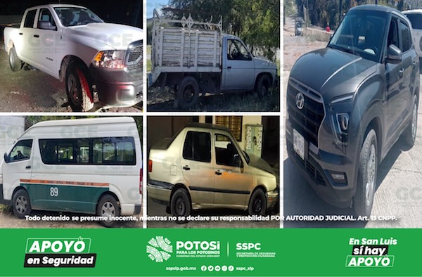 S.L.P.- Como resultado de la reacción inmediata a situaciones que ponen en riesgo la paz de la ciudadanía potosina, agentes de la Guardia Civil Estatal (GCE) aseguraron en las últimas 24 horas ocho vehículos con reporte de robo y se detuvo a tres hombres quienes presumiblemente se desplazaban a bordo de dichas unidades.