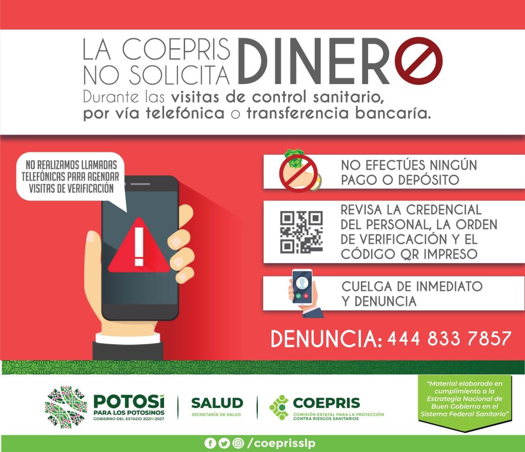 Con la finalidad de evitar que la población, en especial los establecimientos de productos o servicios sean víctimas de algún fraude, la Comisión Estatal de Protección Contra Riesgos Sanitarios (COEPRIS) informa que las visitas de control sanitario a algún establecimiento no se programan vía telefónica, que al momento de la visita no se solicita dinero para algún trámite y que nuestro personal se presenta debidamente identificado con gafete y orden de verificación con códigos QR.