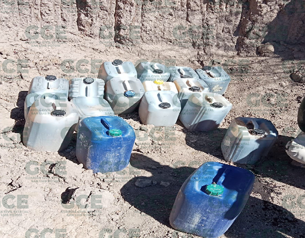 En el lugar se ubicaron 17 bidones con una sustancia desconocida, etiquetados como indicios de un trabajo de investigación en la zona Huasteca, de inmediato dieron aviso a las autoridades de la FGE, quienes indicaron ser parte de los indicios de una carpeta de investigación en Tancanhuitz.