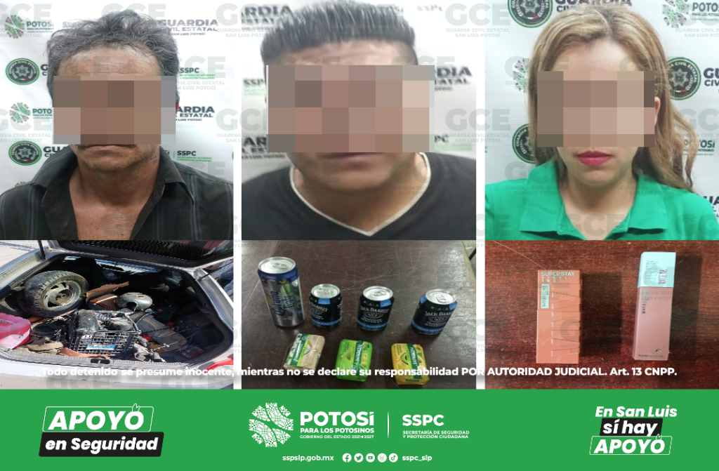 S.L.P.- Gracias a los llamados de auxilio solicitados por la ciudadanía a través de la Línea de Emergencias 911, policías de la Guardia Civil Estatal (GCE) detuvieron a tres personas en distintas acciones, por el probable delito de robo.