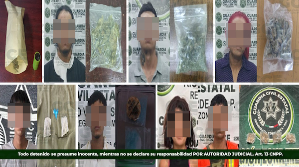 En la colonia Valle Campestre, Axel “N” de 22 años de edad, fue detenido con una bolsa con marihuana; Erik “N” de 23 años, fue ubicado en la colonia Santuario, con una dosis de “cristal”; sobre la colonia Garita de Jalisco, Vicente “N” de 27 años, fue asegurado con una bolsa con marihuana; José “N” de 36 años, fue ubicado en la colonia El Rosedal, con una dosis de marihuana; en el Condado del Sauzal, Claudia “N” de 30 años, fue asegurada con una dosis de marihuana; José “N” de 22 años, fue asegurado con una dosis de “cristal”.