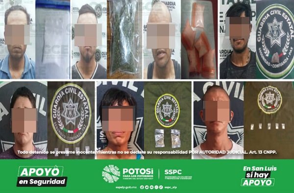 S.L.P.- Guardia Civil Estatal (GCE) efectuó la detención de 13 personas en diferentes acciones operativas, tanto en la capital como en el interior del Estado, los detenidos presumiblemente fueron sorprendidos con dosis de enervantes en su poder.