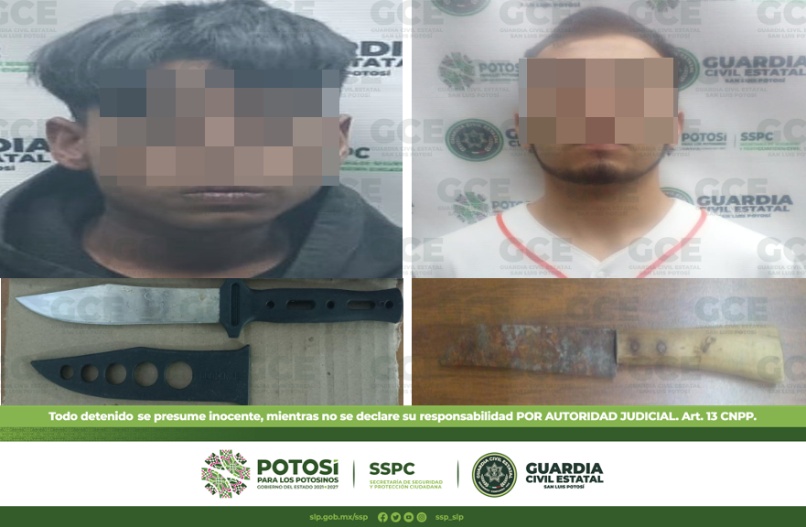 S.L.P.- En el marco del reforzamiento de las acciones preventivas con el propósito de disuadir hechos con apariencia de delito, en distintas acciones realizadas en la capital potosina y en el Municipio conurbado de Soledad, agentes de la Guardia Civil Estatal detuvieron a dos masculinos por el presunto delito de portación de arma prohibida.