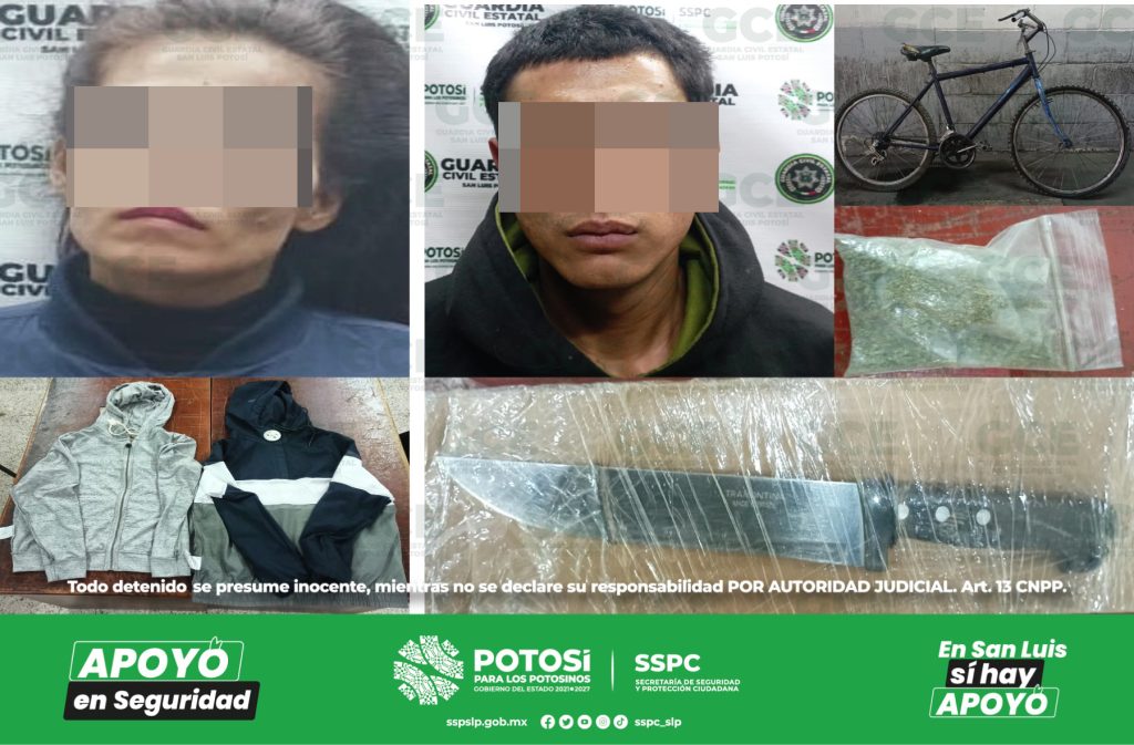 San Luis Potosí, S.L.P.- Gracias a la coordinación entre oficiales de la Guardia Civil Estatal (GCE) y la ciudadanía, se logró la detención de un hombre y una mujer, en diferentes hechos de la zona metropolitana, tras ser denunciados por el probable delito de robo; en ambos casos se recuperó el producto del hurto.