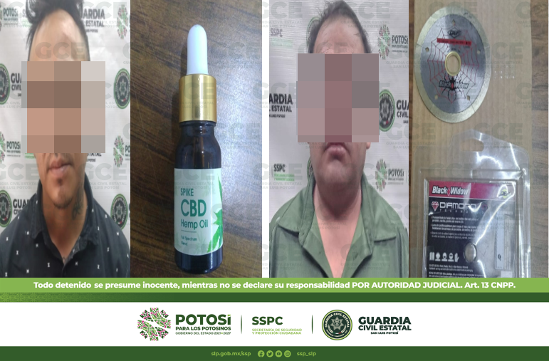 San Luis Potosí, S.L.P.- Gracias a las denuncias de la ciudadanía que son atendidas en el Sistema de Emergencias 911, dos hombres resultaron detenidos por Guardia Civil Estatal (GCE), después de que fueran señalados del probable robo de artículos de diferentes negocios en la capital potosina.