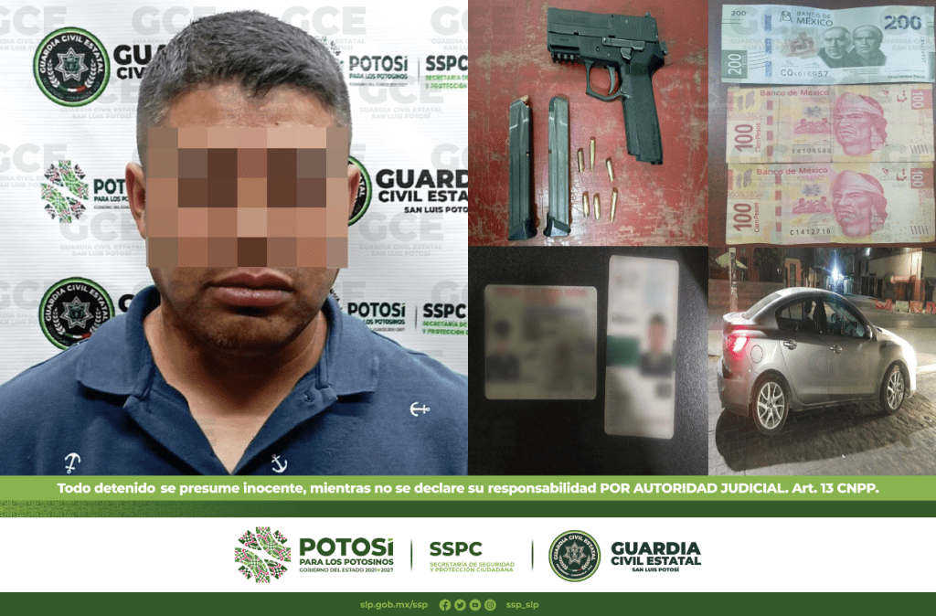 En patrullajes de seguridad y de prevención de delitos, emitidos en la zona centro de la capital potosina, oficiales de la Guardia Civil Estatal (GCE) detuvieron a un hombre por los presuntos delitos de portación de un arma de fuego y de cohecho, luego de que lo observaron conduciendo en sentido contrario.