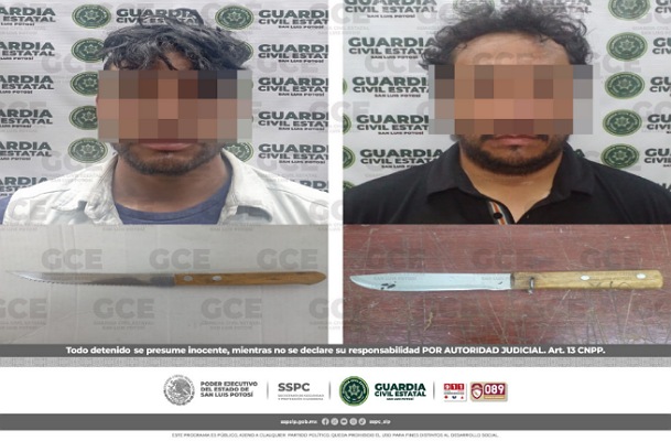 San Luis Potosí S.L.P.- Agentes de la Guardia Civil Estatal, detuvieron a dos hombres por el presunto delito de portación de arma prohibida, como parte de los dispositivos preventivos que se mantienen de forma permanente en la capital potosina.