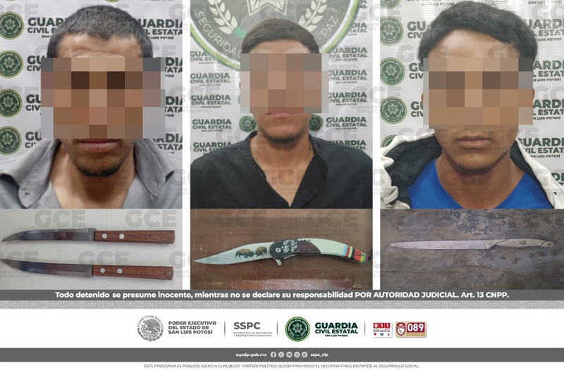 San Luis Potosí, S.L.P.- Agentes de la Guardia Civil Estatal (GCE) detuvieron a tres personas en diferentes acciones, por el probable delito de portación de armas blancas. Estos hechos ocurrieron en colonias ubicadas en la capital potosina.