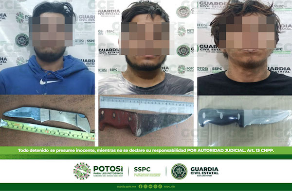 San Luis Potosí, S.L.P.- Mediante los recorridos preventivos y disuasivos, efectuados por oficiales de Guardia Civil Estatal (GCE) en la capital potosina, tres hombres fueron detenidos por el probable delito de portación de armas blancas.