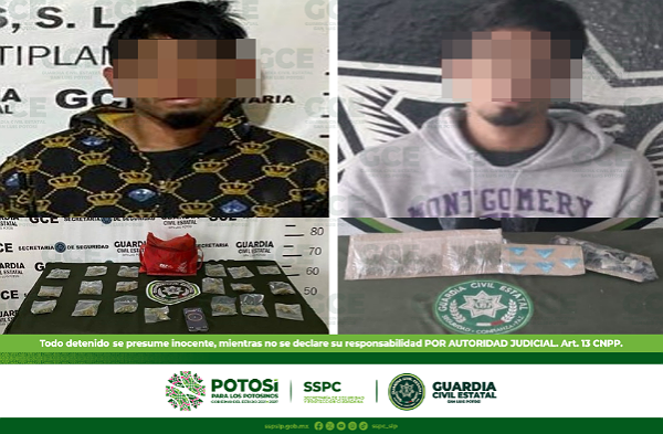 S.L.P.- Como resultado del combate frontal a la delincuencia, dos presuntos miembros de grupos delictivos fueron detenidos por agentes de Guardia Civil Estatal (GCE), luego de asegurarles narcóticos entre sus pertenencias.