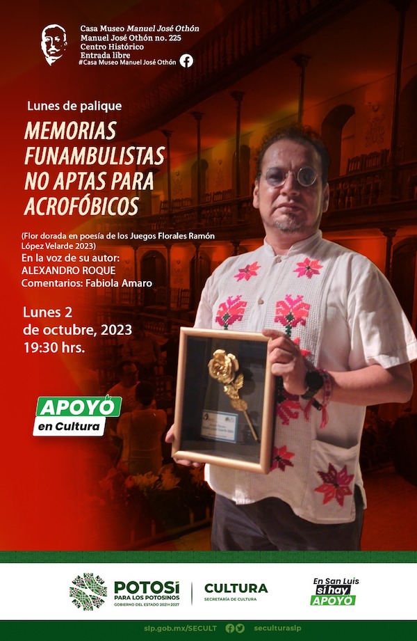En San Luis Potosí si hay apoyo en cultura, y como resultado del programa Lunes de Palique de la Casa Museo Manuel José Othón, la Secretaría de Cultura de Gobierno del Estado, invita a la presentación y lectura del nuevo poemario de Alexandro Roque, con comentarios de Fabiola Amaro, el lunes 2 de octubre a las 19:30 h, con entrada libre.