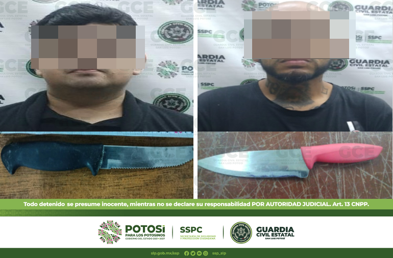 San Luis Potosí, S.L.P.- Mediante los operativos de seguridad, encaminados a inhibir acciones que puedan vulnerar la integridad de las familias potosinas, dos hombres fueron detenidos en distintos puntos de la zona metropolitana, después de que agentes de la Guardia Civil Estatal (GCE) les aseguraran cuchillos entre sus pertenencias.
