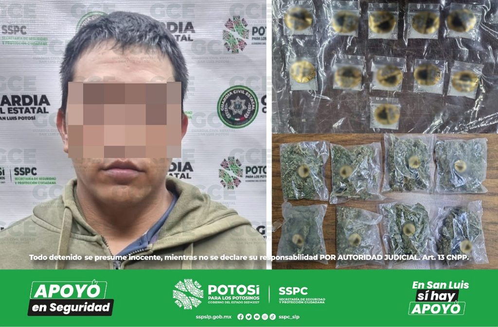 Santa María del Río, S.L.P.- Un probable integrante de una red delictiva fue detenido con dosis de marihuana y “cristal”, tras los operativos desplegados por agentes de la Guardia Civil Estatal (GCE) en el municipio de Santa María del Río.