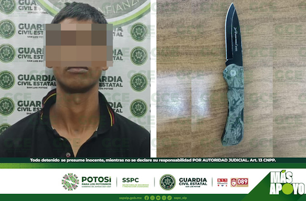 San Luis Potosí, S.L.P.- Mediante los recorridos de seguridad y vigilancia, efectuados en el primer cuadro de la capital potosina, efectivos de la Guardia Civil Estatal (GCE) detuvieron a un hombre, por el presunto delito de portación de una navaja.