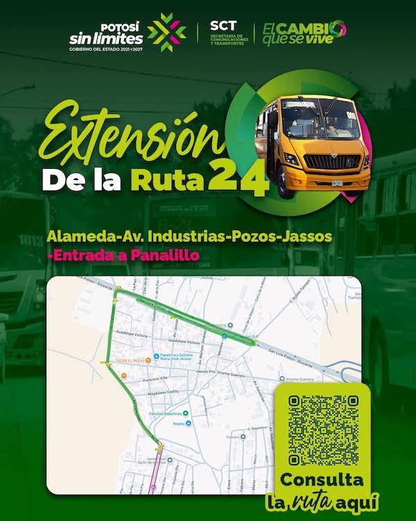 Siguiendo la instrucción del Gobernador Ricardo Gallardo Cardona de fortalecer una movilidad más eficiente y accesible, la Secretaría de Comunicaciones y Transportes (SCT) anunció la nueva Ruta 24 del transporte público concesionado Alameda – Avenida Industrias – Pozos – Jassos, con entrada a Panalillo, la cual ya se encuentra disponible en Google Maps como parte de la estrategia de modernización del transporte público.