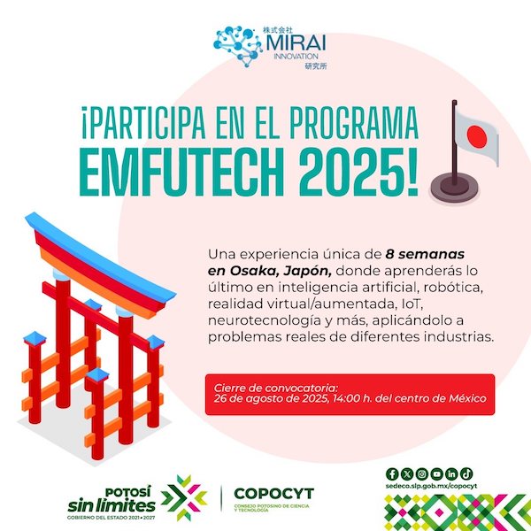 El Consejo Potosino de Ciencia y Tecnología (Copocyt) convoca a estudiantes de posgrado de programas presenciales a participar en el Programa de Formación en Tecnologías Emergentes del Futuro, EmFuTech 2025, que se llevará a cabo en Osaka, Japón del 29 de septiembre al 21 de noviembre de 2025. Este programa intensivo de ocho semanas combina capacitación técnica, proyectos aplicados, mentorías especializadas y participación en la Expo Mundial Osaka 2025.