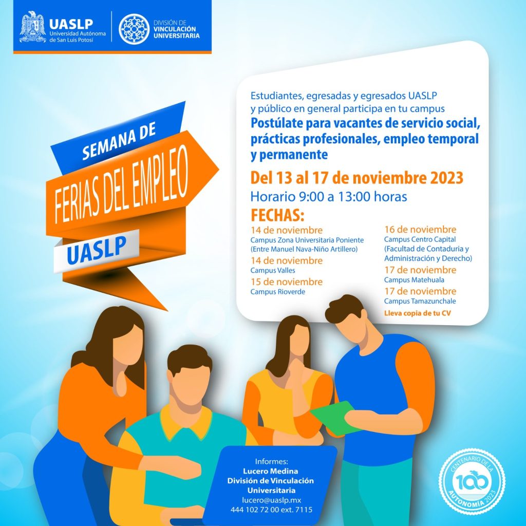 La Universidad Autónoma de San Luis Potosí, a través de la División de Vinculación Universitaria, ha organizado en sus diferentes campus, del 13 al 17 de noviembre, la Semana de Ferias del Empleo, para que estudiantes egresados y público en general, conozcan la oferta de vacantes de Servicio Social, Prácticas Profesionales, así como empleo temporal y permanente, que ofrecen instituciones y empresas, públicas y privadas. Los interesados pueden postularse para ocupar las oportunidades laborales que se ponen a su disposición.