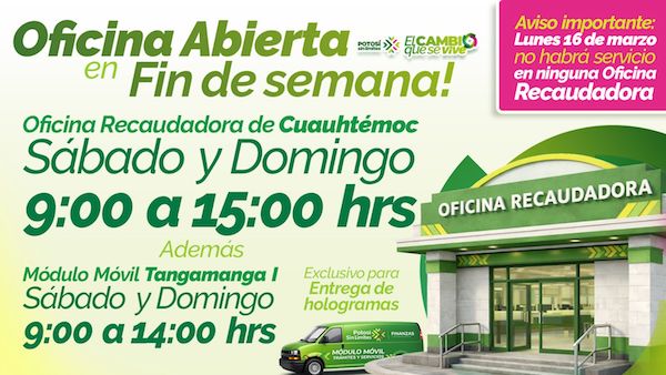 La Oficina Recaudadora de Cuauhtémoc brindará servicio sábado y domingo en un horario de 8:00 a 15:00 horas. De igual manera, continuará habilitado el módulo para entrega de hologramas en el parque Tangamanga I, donde las personas podrán recogerlo de 9:00 a 14:00 horas presentando identificación oficial y copia del comprobante de pago del control vehicular.