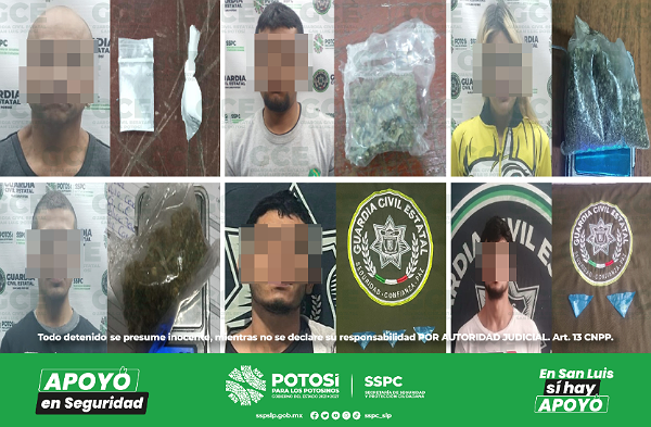 El primer hecho se registró en la colonia Industrial San Luis, José Ángel “N” de 19 años de edad, fue detenido con una dosis de marihuana; durante los operativos de seguridad en la colonia Jaime Torres Bodet, José “N” de 25 años, quedó detenido con una dosis de marihuana; mediante los recorridos en la colonia Los Álamos, José Armando “N” de 47 años, fue detenido con una dosis de “cristal”; en el fraccionamiento La Libertad, José “N” de 27 años, fue detenido con una dosis de marihuana; por su parte, en la colonia Rinconada del Palmar, Juan “N” de 46 años, fue asegurado con una dosis de “cristal”.