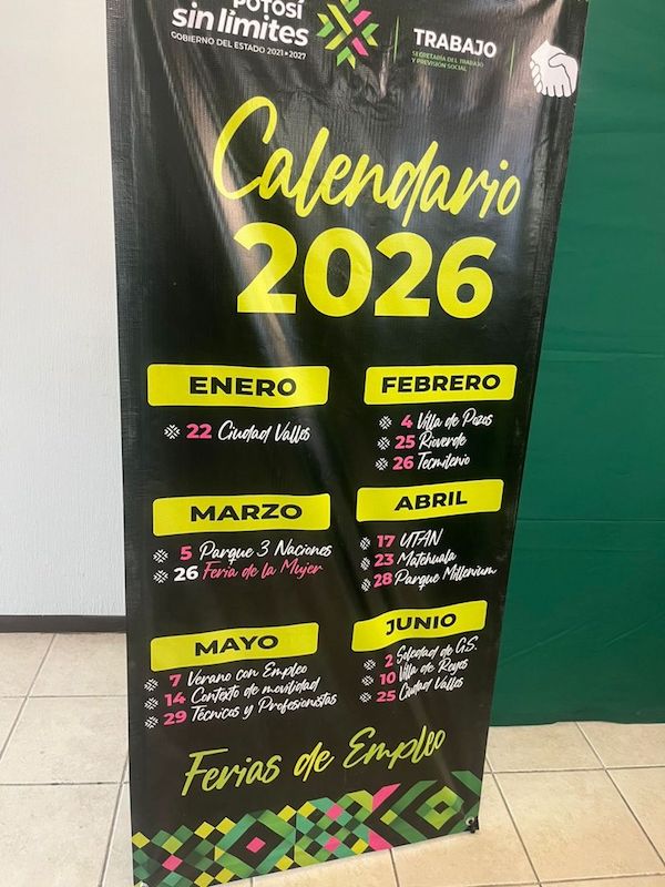 Con un cambio que ya se vive y se siente en todo el estado, el Gobierno que encabeza Ricardo Gallardo Cardona continúa impulsando el empleo y el desarrollo económico. A través de la Secretaría del Trabajo y Previsión Social presentó el Calendario Preliminar 2026 de Ferias de Empleo, que se realizarán en la capital y en Ciudad Valles, Matehuala, Rioverde, Tamazunchale y Villa de Reyes, acercando oportunidades laborales sin que la población tenga que salir de su región.