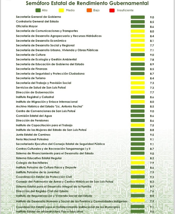 El Semáforo Estatal de Rendimiento Gubernamental clasifica el desempeño de las y los funcionarios en niveles: alto de color verde; medio, amarillo; bajo, naranja e, insuficiente, de color rojo, con calificaciones que incluyen la respuesta inmediata y eficiente a las solicitudes de apoyo, las relaciones interinstitucionales, la eficiencia en la difusión y el cumplimiento del Plan Estatal de Desarrollo.