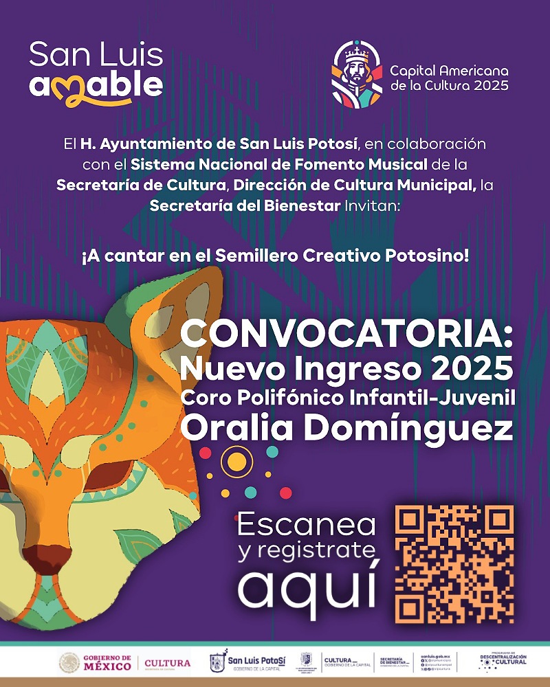 El H. Ayuntamiento de San Luis Potosí en colaboración con el Sistema Nacional de Fomento Musical de la Secretaría de Cultura Federal y la Secretaría del Bienestar Municipal, invitan a ser parte del Coro Polifónico Municipal Infantil Juvenil “Oralia Domínguez”.