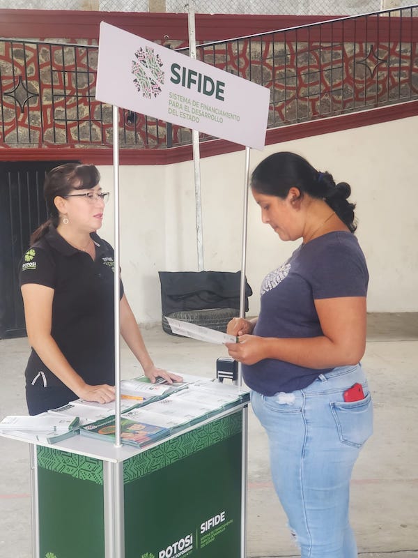 En apoyo al impulso de la economía de las cuatro regiones, para que las familias tengan una mejor calidad de vida y generar oportunidades para todas y todos, el Sistema de Financiamiento para el Desarrollo del Estado (Sifide), instaló un módulo en el municipio de Alaquines para difundir su cartera de créditos de fácil acceso, a través de foros informativos con personas interesadas en iniciar o hacer crecer un negocio.