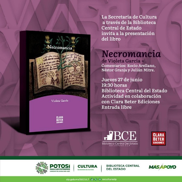 La Secretaría de Cultura (Secult), invita a las presentaciones de los libros «República Sorjuaniana de México», del escritor Víctor Manuel López Ortega y «Necromancia», de la escritora potosina Violeta García, el viernes 21 y jueves 27 de junio respectivamente, en la Biblioteca Central del Estado a las 19:30 horas.