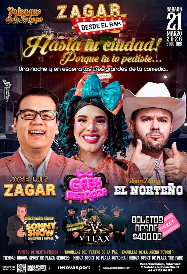 Siguiendo la instrucción del Gobernador del Estado, Ricardo Gallardo Cardona, de fortalecer la oferta de entretenimiento para las familias potosinas, el Patronato de la Feria Nacional Potosina (Fenapo) presentará el sábado 21 de marzo a las 21:00 horas una gran velada de comedia en el Palenque, encabezada por José Luis Zagar con su espectáculo “Desde el Bar… Hasta tu ciudad, porque tú lo pediste”, acompañado por Gaby Mendoza y Edson Zúñiga “El Norteño”, quienes prometen una noche llena de humor y cercanía con el público.