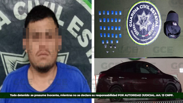 En la colonia La Diana, agentes de la GCE le aseguraron al detenido, 28 dosis de la droga sintética conocida como “cristal”, cinco dosis de “crack”, además de un vehículo Nissan Versa, en el que se desplazaba.