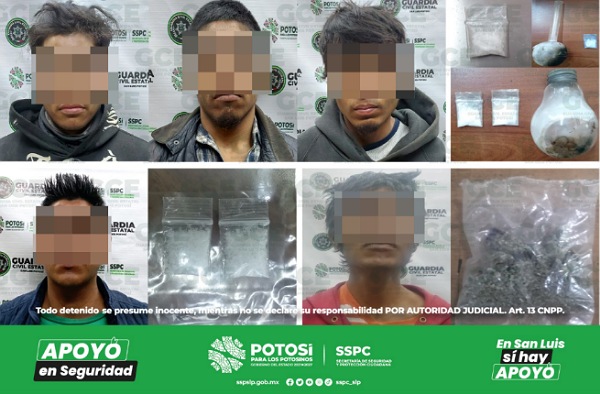 En la zona centro de Soledad de Graciano Sánchez, Jesús “N” de 20 años de edad fue detenido con dos dosis de “cristal”; sobre la colonia La Libertad, efectivos de la GCE detuvieron a Gabriel “N” de 54 años con una dosis de marihuana; Christian “N” de 20 años, fue asegurado con dos dosis de marihuana en la colonia Primera de Mayo; sobre la colonia Santo Tomás, Jonathan “N” de 19 años, fue detenido con una bolsa con marihuana; efectivos de la GCE detuvieron a Mario “N” de 50 años, con dos dosis de marihuana.
