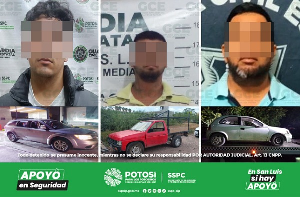 S.L.P.- La aplicación del Plan Integral de Seguridad por parte de la Guardia Civil Estatal (GCE) permitió la detención de cuatro hombres, tres de ellos sorprendidos a bordo de unidades con placas sobrepuestas y uno más con un vehículo que contaba con reporte de robo.
