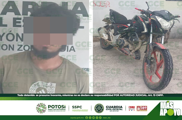 Agentes de la GCE detectaron en la zona centro del municipio de Lagunillas, a un masculino identificado como Oscar “N” de 19 años de edad, quien fue señalado previamente por la víctima, como el presunto responsable de haberlo despojado de su motocicleta marca Italika, minutos antes, por ello indicó que procedería legalmente en su contra. Cabe señalar que dicha persona posiblemente esté vinculada a un grupo criminal, generador de violencia.
